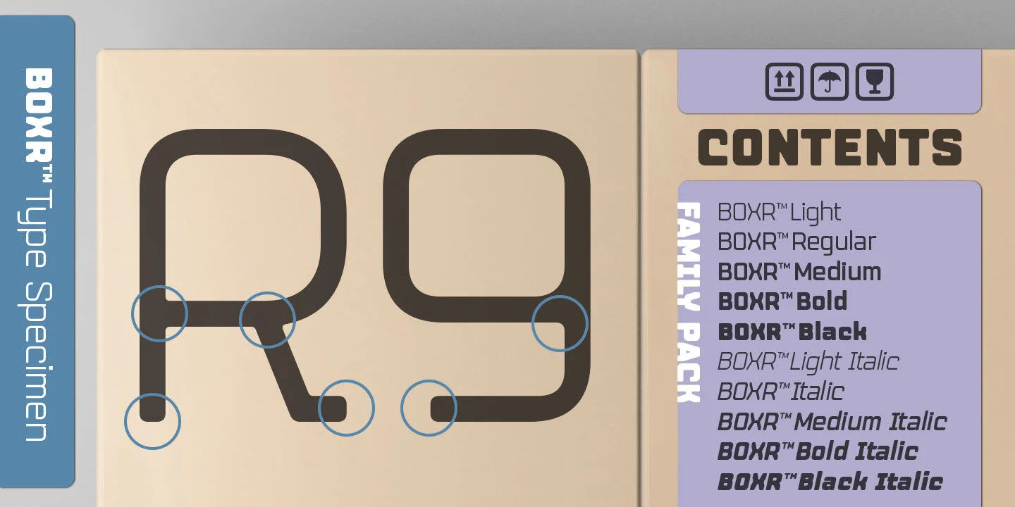 Boxr™ is a contemporary rectangular font family that finds the perfect balance between form and feel. This versatile sans serif is loaded with font features and an extensive set of icons. Named for its boxy, square shape, this versatile sans typeface features softened corners and connections to achieve a look that is both clean and corporate, yet warm and friendly. Boxr™ is an excellent choice for a variety of projects, including prints, packaging, editorial, and digital design.