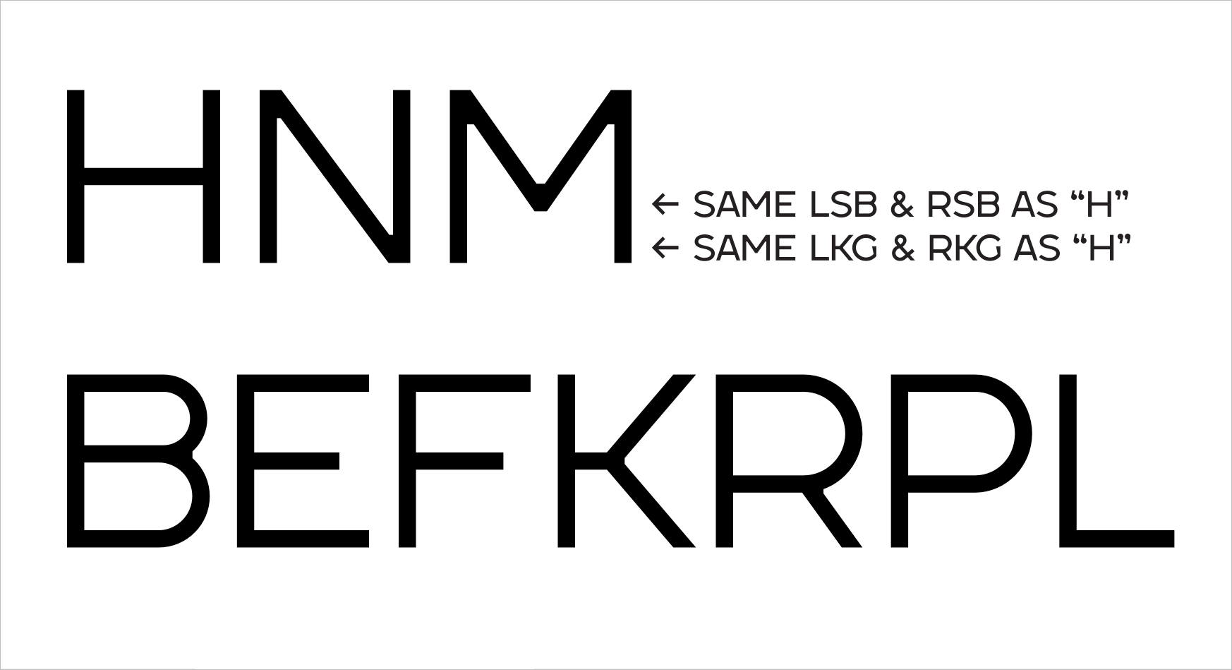 To set kerning group, you should look for the similarity at the left and the right edges of each letter. For example, In the top row of Figure 4, characters like H, N, M share the same LSB, RSB, LKG, and RKG. Why? Because they all have two straight vertical lines on both the left and right side, making their spacing needs identical.