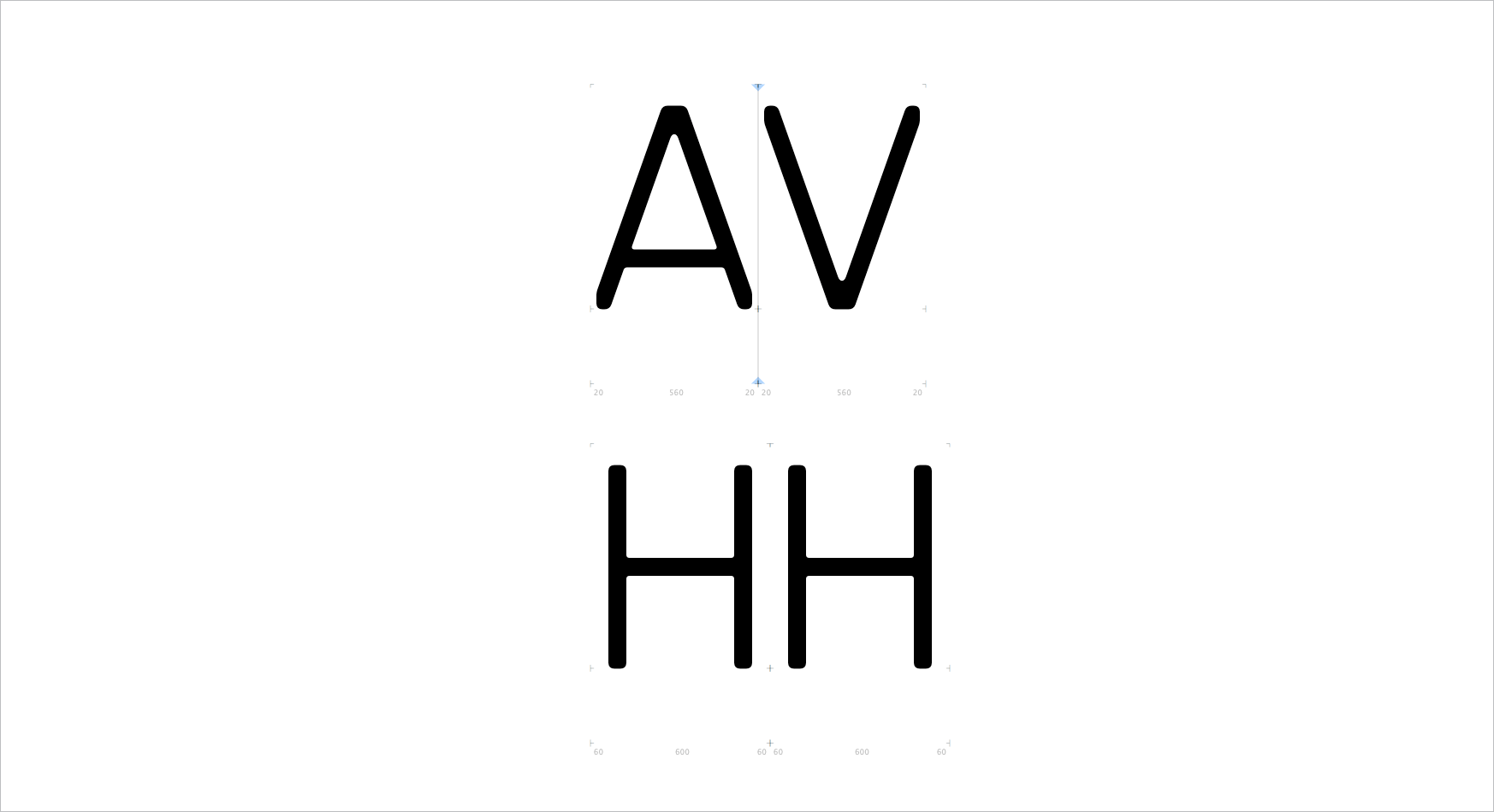 After completing both backend steps mentioned earlier, you will likely still need to kern many letter pairs. Let’s use an AV pair, in Figure 5, as an example. Even if you set the side bearings to the minimum for both characters, the negative space between them is still too broad. That’s when kerning comes into play. The AV pair requires negative kerning to tuck the V under the A, creating a visually tight and pleasing result that matches the visual space of your benchmark HH pair.